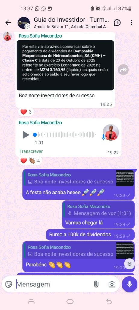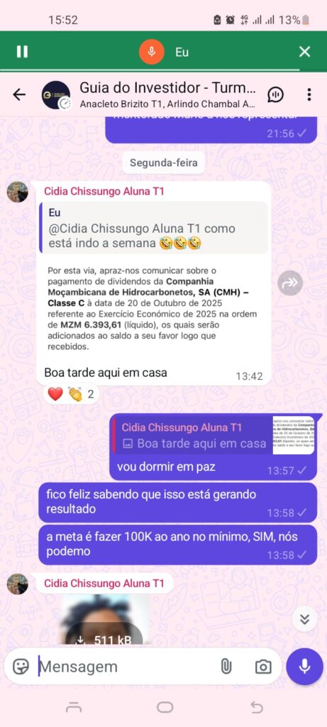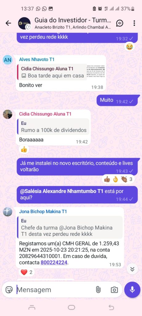 É um programa completo de formação em investimentos na Bolsa de Valores de Moçambique, desenhado para quem quer começar do zero e chegar até ao primeiro dividendo — com segurança, clareza e acompanhamento.